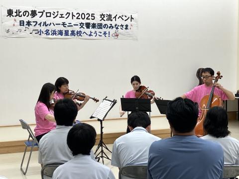 On July 4th and 5th, the Fukushima Prefectural Onahama Kaisei High School team "Jangara" and the MJC Ensemble were visited by the Japan Philharmonic String Quartet (violins Mai Ota, Seiko Onuki, viola Shiori Eto, and cello Tomoki Yamada).