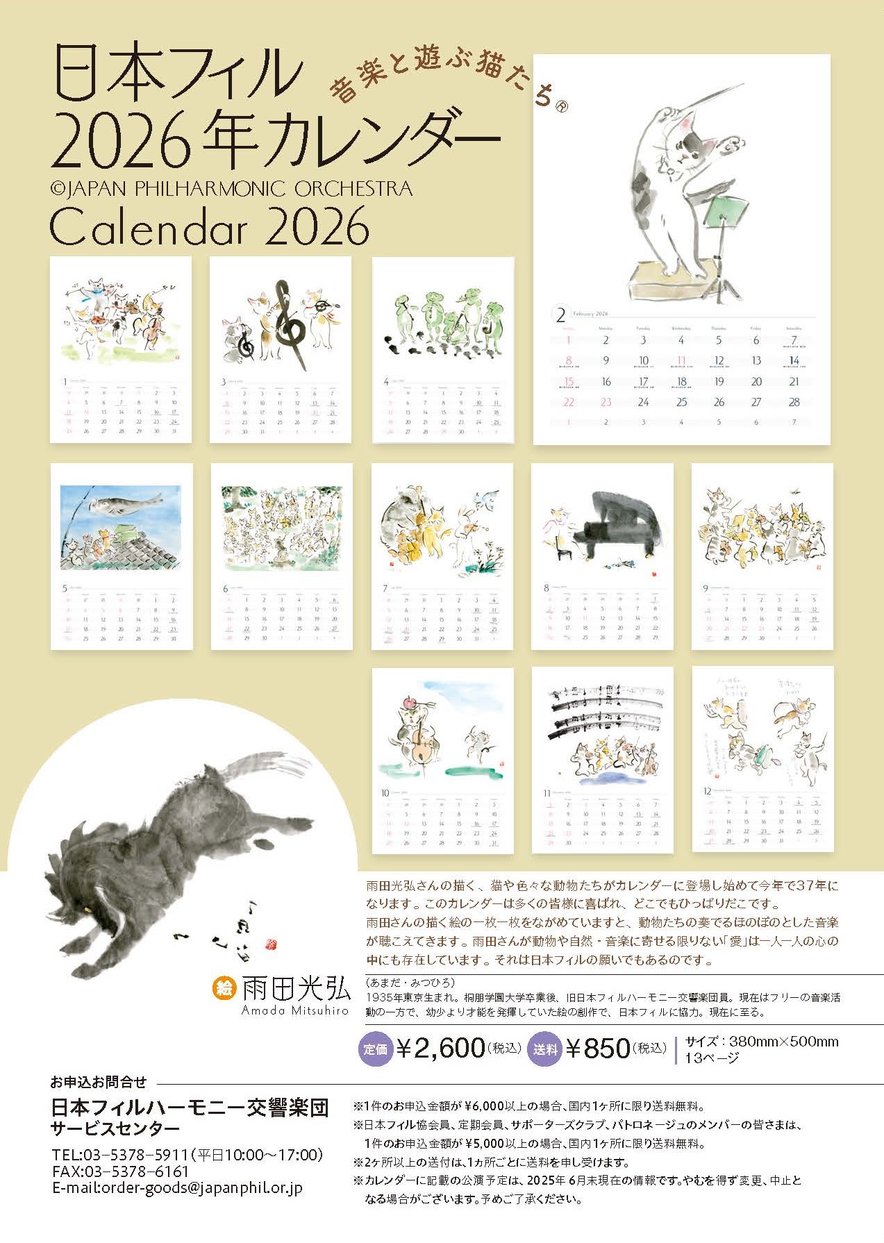 This year marks the 37th year since Mitsuhiro Amada's illustrations of cats and other animals first appeared in the Japan Philharmonic Orchestra's calendar. These calendars have been enjoyed by many people and are in high demand everywhere. Looking at each of Amada's illustrations, one can almost hear the heartwarming music played by the animals. Amada's boundless love for animals, nature, and music exists in the hearts of each and every one of us. That is also the wish of the Japan Philharmonic Orchestra.
