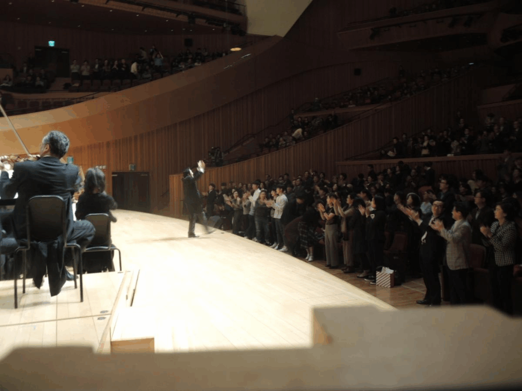 In response to the endless encores, the wind and percussion players reappeared. With a wave of the maestro's hand, the clappers rang out again, and the final section of Toyama's work began. As the Japan Philharmonic played "Yagibushi," Oue stepped down from the podium, spread his arms to the audience, and began clapping along. The audience also rose to their feet and clapped along with the orchestra, sending the Daegu Concert House into a frenzy. After the performance, an elderly man was waiting in front of the orchestra bus. As soon as he realized I was a member of the orchestra, he approached me, pointed to Toyama's name on the program with a broad smile, and asked for a warm handshake.