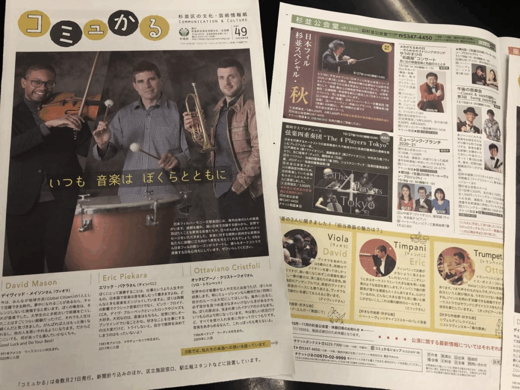 David Mason (viola/USA), Ottaviano Cristofoli (solo trumpet/Italy), and Eric Pacella (timpani/USA) have graced the cover of Suginami Ward's culture and arts information newspaper, "Commukaru."